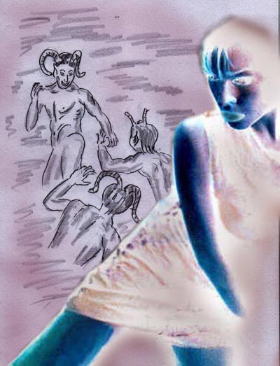 "Ich fand mich auf einer unauffälligen Stadtstraße, als ich ein klares Bewußtsein erlangte. Alles um mich war wie ausgestorben. Etwas ratlos schritt ich die Straße entlang und dachte nach, ob ich mich in einem bewußten Traum oder in einer Astralwelt befände, als ich die Rückseite einer Kirche erblickte. Es war eine hohe, schmucklose Steinwand aus großen, grauen Quadern. Diese fensterlose Rückseite der Kirche trug etwas an Verheimlichung in sich, so empfand ich es. Damit war auch meine Neugierde geweckt und ich ging näher heran.Beim Näherkommen erblickte ich zwei unauffällige, geschlossene Holztüren, von denen ich eine durchschritt. Sie öffnete sich in einen Vorraum, von dem aus einige Stufen in den Keller führten und einige Stufen empor zur Kirchenhalle. Ich schritt letztere empor und befand mich zu meinem Erstaunen in einem domartigen Kirchengewölbe, anscheinend ohne Dach und im Tageslicht. In der Mitte war ein Schuttberg, den ich erkletterte. Hierbei gewahrte ich, daß ein Großteil der Steine aus gestürzten Figuren von buntem Marmor bestand. Gerade wollte ich diese Figuren genauer untersuchen, als ich durch das Tor der Vorhalle zwei riesige Vogelbeine erblickte. Der Rest war von meinem Blickpunkt aus nicht zu erkennen. Doch ich erahnte, daß es sich um eine menschenähnliche Gestalt von ca. 3 bis 4 Meter Größe handeln mußte. Mein empathischer Sinn sagte mir auch, daß diese Gestalt einen stählernen Panzer trug. Die Ausstrahlung dieses Wesens war erdrückend und machtvoll und nahm an Intensität schnell zu. Meine Anwesenheit wurde anscheinend bemerkt. Ich sah mich durch diese machtvolle Ausstrahlung von Haß in höchster Gefahr und suchte schleunigst das Weite. Ich durchquerte zwei Seitenhallen und gewahrte zu meinem großen Glück eine eingestürzte Wandstelle, durch die ich ins Freie springen konnte."