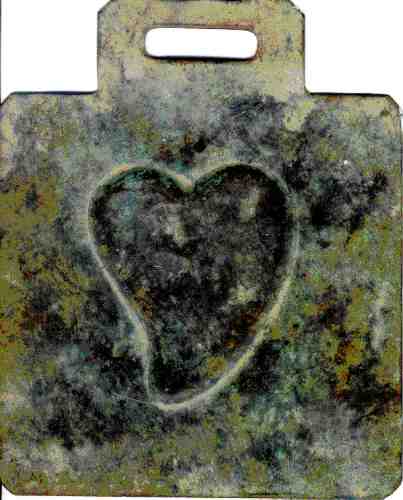 Diess Bild zeigt die Form eines Herzens, aus einem Kupferblech von ca 1 mm Staerke herausgetrieben. Das Blech ist knapp groesser als eine 3,5" Diskette. Die Oberflaeche ist stark oxydiert. Oben ist ein schlitzformiger Durchbruch, an welchem diese Platte aufgehaengt werden kann.