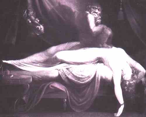 Der Alb (Elf) drückt auf die Brust (hier etwas frei gestaltet der Bauch) auf die Schlafende und erschwert die Atmung