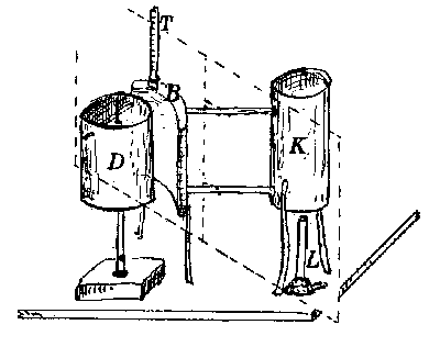 Der Kessel (K) wurde mit Wasser gefüllt und dieses erwärmt. Ein doppelwandiges Gefäß (B), in Abstand und Biegung gleich der Hand zum Zylinder (D), mit dem Kessel durch Röhren verbunden, wurde mit erwärmten Wasser gefüllt. Das Experiment zeigte keinen Effekt innerhalb von Temperaturen zwischen 35 und 100 Grad C.