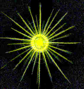 In der Stunde von Swami Vayuananda übtern wir eine Lichtübung. Ich war durch das vorhergehende Singen sehr aufgeschwungen, so daß die Lichtübung sehr gut gelang. Während der Übung sah ich von einem hellen Lichtzentrum Strahlen weggehen. Diese strahlten radial nach allen Seiten. Ein paar Zentimeter von dem Lichtzentrum sah ich, wie sich zart durchsimmernde Kreise bildeten.
