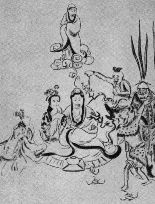 Hierzu ein Bild von einem Taoisten, der in seiner Meditation von Dämonen gequält wird, die ihn am Körper zupfen und abzulenken versuchen. Die schöne Frau steht für Sinnlichkeit, die ebenfalls aufkommen kann und für sexuelle Phantasien.