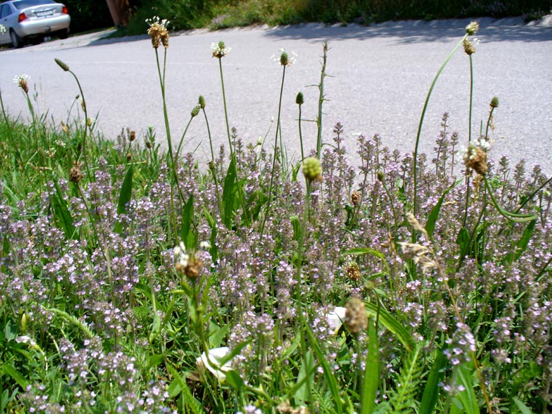 Pannonischer Rasen: Thymian, Klee und Spitzwegerich Pannonien: Ursprünglich war dies die Bezeichnung einer römischen Provinz. Gegenwärtig versteht man darunter einen geologischen Raum mit einer typischen Flora und Fauna. Der größte Teil der Pannonischen Tiefebene liegt in Ungarn. Sie wird von den Alpen, den Karpaten, dem Balkan und dem Dinarischen Gebirge umfasst und von Donau und Theiß durchflossen. Das nördliche Burgenland, in dem ich wohne, gehört dazu. Inselartige Flecken als letzte Ausläufer finden sich bis Wien (z.B. Bisamberg, Leopoldsberg, Klosterneuburg) Pannonien besitzt ein relativ trockenes Klima mit heißen Sommern. Für das Burgenland gelten durchschnittlich über 300 Sonnentage im Jahr. Das zum tieferen Verständnis der Bezeichnung "pannonisch" und den Grundgegebenheiten der hiesigen Flora. Das nördliche Burgenland, in dem ich wohne, ist eine trockene und im Sommer heiße kontinentale Steppenzone. Feuchtrasen: In einer heißen, trockenen Steppenzone einen englischen Feuchtrasen zu säen ist naturwidrig. Aber natürlich hat der englische Feuchtrasen auch seine Vorteile, sonst hätte er nicht eine derart konkurrenzlose Verbreitung gefunden. Was sind seine Vorteile und Kennzeichen? Er besteht aus einer feinblättrigen und sehr wüchsigen Grasart, welche die Schäden, die durch starke Beansprucheung entstehen, durch die starke Wüchsigkeit wieder ausgleichen kann. Als Gegenleistung benötigt diese Grasart einen nährstoffreichen Boden und viel Wasser - im Sommer muss täglich gegossen werden. Steppenrasen: Darunter versteht man eine Bodenbegrünung, die sich aus einer niederwachsenden Mischflora ergibt. Früher war der pannonische Raum eine Weidelandschaft. Die von daher stammende Pflanzengesellschaft ist noch ausreichend vertreten, um bei entsprechend selektiven Gegebenheiten wieder als rasenbildende Pflanzendecke in Erscheinung zu treten. Sie hält keine übermäßige Beanspruchung aus, etwa jene eines Fußballfeldes. Die Pflanzen sind jedoch trittfest und kommen mit wenig Wasser aus. Sie wollen relativ selten gemäht werden, etwa wenn die Wuchshöhe 10 cm übersteigt. Das Mähen wirkt selektiv und ermöglicht den nieder wachsenden Blütenpflanzen das Überleben gegenüber höher wachsenden Gräsern. Richtig behandelt entwickelt sich ein solcher Rasen zu einer anspruchslosen Decke zahlreicher Blütenpflanzen. Von Monat zu Monat zeigt ein solcher Rasen ein neues, meist andersfärbiges Blütenkleid.
