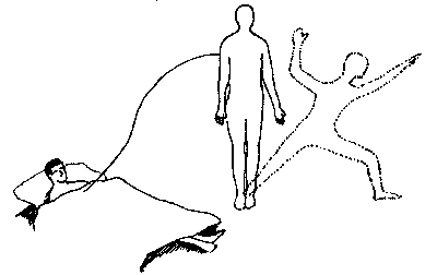 Der Leser mag sich fragen, was solche angsteinflössenden Erfahrungen denn mit einem Königsweg zu tun haben, und wohin dieser Weg eigentlich führe. Sicher muss bei einer Körpertrennung zuerst eine Furchtschranke durchbrochen werden, aber alles uns Unbekannte, Neue weckt in uns zunächst Ängste. Nicht ohne Grund ist die ausserkörperliche Erfahrung als der kleine Tod bezeichnet worden. Aber welch atemberaubende Dimension öffnet sich dann, wenn die Schranke einmal furchtlos durchschritten werden kann. Wenn sich unser Ich-Bewusstsein mit oder ohne Körper vom irdischen Leib trennen kann, ohne dass die Kontinuität der Bewusstheit unterbrochen wird, so weist das nämlich darauf hin, dass in der Stunde des Todes ein ähnlicher Vorgang stattfindet. Im medizinische Terminus "Exitus" schwingt ja noch etwas vom Entweichen einer feinstofflichen Seele aus dem materiellen Körper mit (9). Der entscheidende Unterschied zur Ausserkörperlichkeit liegt darin, dass in der Todesstunde die Silberschnur, die den Feinstoffkörper mit dem irdischen Leib verbindet, endgültig unterbrochen wird. Entgegen allen bioenergetischen und biochemischen Messdaten und Ansichten der Naturwissenschaft führen mich meine Erlebnisse zum Schluss, dass der Astralkörper ein steuerndes, lebensnotwendiges Fluidum, eine bisher noch von keiner Messtechnik quantifizierte Art von Energie durch dieses Band dem materiellen Körper zuführt.