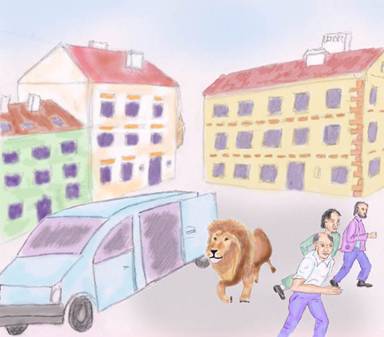 Ich befand mich am Rand eines Platzes, der von mehrstöckigen Häusern im Baustil der Gründerzeit umgeben war. Der Platz war mit alten, abgerundeten Kopfsteinen gepflastert. Es hätte ein Teil von Wien sein können. Es waren eine Menge Leute dort, in kleinen Gruppen und einzeln dahin schlendernd. Ich sah mir alles interessiert an. Da kam ein Lieferwagen in der Art eines Volkswagens und blieb an dem von mir gegenüberliegenden Rand des Platzes stehen. Zu meiner Überraschung stieg ein großer Löwe mit goldener Mähne aus und ging gemächlich an den erstaunten und erschrockenen Leuten vorbei in meine Richtung. Diesmal hatte ich keine Angst. Vielleicht hatte ich auf meine Angst vergessen, weil die Situation so unerwartet und bizarr war. Ich schaute einfach zu, wie der Löwe dort wo er ausgestiegen war zufrieden den Platz überquerte und die Leute ignorierte, als wären sie nicht vorhanden. Natürlich musste er sich nicht zwischen den Leuten durchzwängen, denn sie wichen nach allen Seiten aus. Inzwischen schien das Auto außen herum gefahren zu sein. Jedenfalls kam es links von mir aus einer Seitengasse und blieb etwa 10 Meter von mir entfernt am Rand des Platzes stehen.