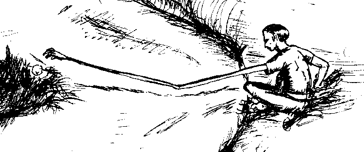 Bal.: "Nachdem ich ein wenig interessantes Dorf durchquert hatte, setzte ich mich auf die Böschung des Straßenrandes, unschlüssig was ich weiter tun sollte. Es war eine gewöhnliche Landstraße, breit genug für einen Verkehr in beiden Richtungen. Da saß ich nun und betrachtete die Steine, die so auf der Straße herumlagen. Das brachte mich auf die Idee einmal auszuprobieren, ob ich nach dem Stein, schräg auf der anderen Seite langen konnte, ohne aufzustehen. Der Stein lag also 2-3 m entfernt. Ich streckte meinen rechten Arm aus und dehnte ihn, bis ich tatsächlich den Stein fassen konnte. Diese neue Entdeckung bereitete mir Freude und ich machte noch ausgiebig Gebrauch davon, indem ich nach allen möglichen Steinen und auch einem Papierknäuel haschte, alles ungefähr im gleichen Umkreis."