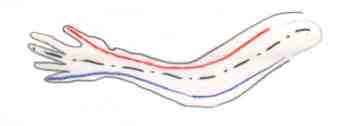 (Detto) "Die Arme zeigen für sich das selbe Bild; der rechte scheint zunächst zur Gänze blau, der linke gelb. Ausgestreckt aber, mit der Handfläche nach rückwärts, weist der rechte für den Sensitiven längs seiner ganzen Innenseite, d.h. auf der Seite des Daumens, im Indigoblau einen schmalen gelben Streifen auf, der linke im Orangegelb einen dünnen blauen Streifen an der Seite des kleinen Fingers."