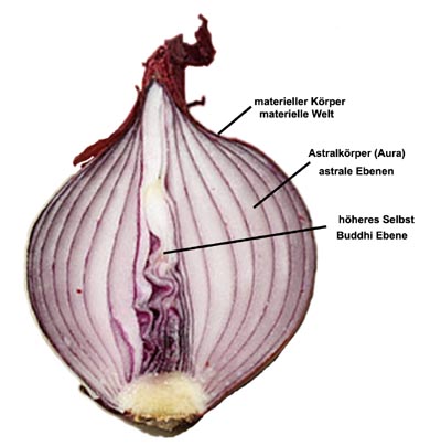 Wir sind wie eine Zwiebel aufgebaut. Das innere Herz ist das höhere Selbst, der ewige, göttliche Teil in uns. Je weiter die Schalen (Hüllen) vom höheren Selbst entfernt sind, desto mehr sind sie durch ein individuelles Bewusstsein geprägt und vom göttlichen Kern getrennt. Am weitesten entfernt ist der materielle Körper.