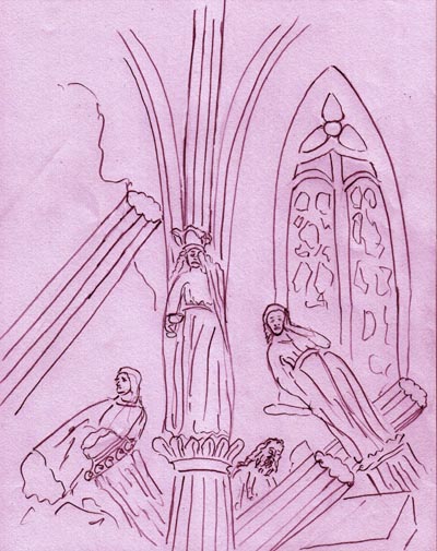 "Ich fand mich auf einer unauffälligen Stadtstraße, als ich ein klares Bewußtsein erlangte. Alles um mich war wie ausgestorben. Etwas ratlos schritt ich die Straße entlang und dachte nach, ob ich mich in einem bewußten Traum oder in einer Astralwelt befände, als ich die Rückseite einer Kirche erblickte. Es war eine hohe, schmucklose Steinwand aus großen, grauen Quadern. Diese fensterlose Rückseite der Kirche trug etwas an Verheimlichung in sich, so empfand ich es. Damit war auch meine Neugierde geweckt und ich ging näher heran.Beim Näherkommen erblickte ich zwei unauffällige, geschlossene Holztüren, von denen ich eine durchschritt. Sie öffnete sich in einen Vorraum, von dem aus einige Stufen in den Keller führten und einige Stufen empor zur Kirchenhalle. Ich schritt letztere empor und befand mich zu meinem Erstaunen in einem domartigen Kirchengewölbe, anscheinend ohne Dach und im Tageslicht. In der Mitte war ein Schuttberg, den ich erkletterte. Hierbei gewahrte ich, daß ein Großteil der Steine aus gestürzten Figuren von buntem Marmor bestand. Gerade wollte ich diese Figuren genauer untersuchen, als ich durch das Tor der Vorhalle zwei riesige Vogelbeine erblickte. Der Rest war von meinem Blickpunkt aus nicht zu erkennen. Doch ich erahnte, daß es sich um eine menschenähnliche Gestalt von ca. 3 bis 4 Meter Größe handeln mußte. Mein empathischer Sinn sagte mir auch, daß diese Gestalt einen stählernen Panzer trug. Die Ausstrahlung dieses Wesens war erdrückend und machtvoll und nahm an Intensität schnell zu. Meine Anwesenheit wurde anscheinend bemerkt. Ich sah mich durch diese machtvolle Ausstrahlung von Haß in höchster Gefahr und suchte schleunigst das Weite. Ich durchquerte zwei Seitenhallen und gewahrte zu meinem großen Glück eine eingestürzte Wandstelle, durch die ich ins Freie springen konnte."