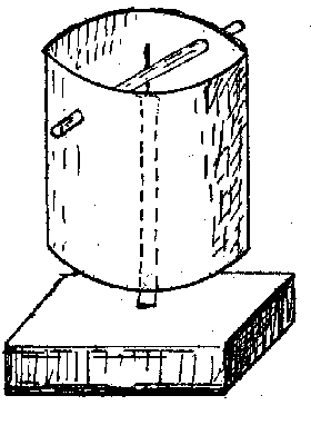 Ein Zylinder aus Papier. Nahe der oberen Kante wird quer ein Strohalm durchgesteckt. Die Mitte des Strohhalmes wird von einer Nadel durchstochen. wobei die Nadelspitze auf einem Schnapsglas aufsetzt (Minimierung der Reibung beim Drehen). Durch Verschieben des Strohhalmes kann der seitliche Schwerpunkt austariert werden. Der Masseschwerpunkt muß unterhalb der Nadelspitze sein.