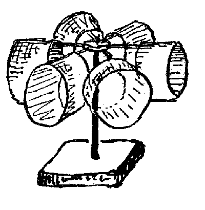 Die Drehachse muß nicht vertikal sein. Horizontale Anordnungen liefen genau so. Ebenso wie Papierzylinder liefen auch Konservendosen oder kleine Tortenformen (das Gewicht wird allerdings größer und die Reibung stärker). Ein Kupferzylinder lief jedoch nicht.