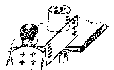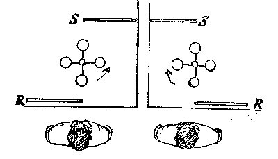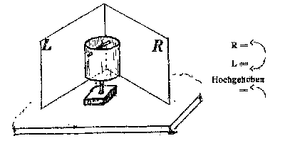 "Der Apparat bleibt in Ruhe, solange wir unsere symmetrische Stellung zu ihm beibehalten. Drehen wir uns aber ein wenig nach rechts oder links, so daß unsere Medianachse nach M1 oder M2 zeigt, so beginnt die Anordnung zu drehen (langsamer als die mit der Hand bewegten Zylinder). Statt den Körper zu drehen, kann man sich auch nach rechts oder links versetzt hin setzen.