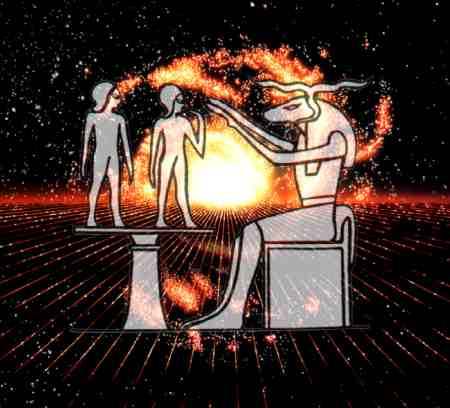 Chnum bildet auf der Töpferscheibe Körper und Ka (Ätherkörper) des Kindes (altägypt.)
