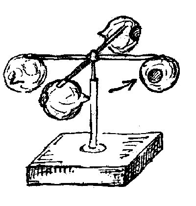 Skizze des aus dem physikalischen Unterricht bekannten akustischen Reaktionsrades (Helmholtz'sche Resonatoren).