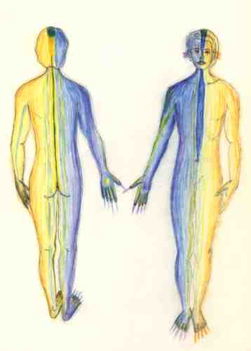 Die Seiten des Körpers, von den Schläfen bis zu den Enden der Hände und Füße, leuchten rechts blau, links gelb; in der Mittellinie scheinen die beiden Farben ineinander zu verfließen. An den äußersten Flanken, wie an den Extremitäten, gehen die Farben in Indigo und Orange über."