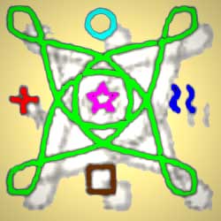 Art Sammel- und Notfall-Symbol. Es beinhaltet die vier Elemente Luft, Wasser, Erde, Feuer und die Ur-Kraft, die in der Sonne und den Atomen zu Hause ist. Harmoniesiert und neutralisiert nicht wünschenswerte Einflüsse oder deren Auswirkungen. Soll nicht heißen, daß wir weiterhin Gift in die Umwelt schütten und uns nur auf dieses Symbol verlassen, sondern zuerst die Ursache beseitigen und parallel dazu mit den Symbolen verantwortungsvoll umgehen. |